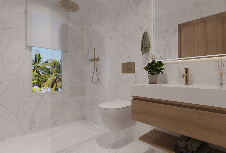 THE Royal Oasis homes ARE FINISHED IN A SOPHISTICATED, YET UNDERSTATED, COLOUR PALETTE, INCLUDING LIGHT OAK FLOORS, DARK GOLD ACCENTS, AND MARBLE SLAB COUNTERTOPS, TO CREATE A DISTINCT YET VERSATILE BACKDROP FOR LIVING.